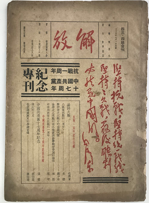 重点展品有红军第四军党代表大会通过的决议,即《中国共产党红军第四军第九次代表大会决议案》,又称《古田会议决议》。会议总结了红军创建以来军队建设的经验,确立了中国共产党领导下的人民军队建设的根本原则,是中国共产党和军队建设的重要纲领性文献。这本1929年的油印本能够保留至今,说明了珍藏者对过去那段岁月的怀念,也印证了习主席所讲的“不忘初心”。《解放》四三·四合刊是另一个亮点,它为抗战一周年、中国共产党成立十七周年而发行的纪念专刊,也是毛泽东著名论述《论持久战》的初刊本。“淮海战役纪念章”、《战役总结汇集》、《西北解放战争史料汇编》等都展现了波澜壮阔解放战争的历史画面。第一届中国人民政治协商会议纪念章、开国大典照片和明信片、《人民日报》1949年10月2日版,都是新中国成立宏伟时刻的历史呈现。彭德怀亲笔题词的《志愿军一日》记述了志愿军在抗美援朝战争的真实经历,《胜利的法宝》记述了志愿军与“联合国军”作战情景,这些都是艰苦卓越革命历史的脉络呈现。